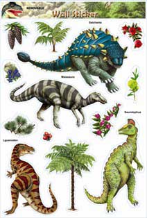 Coole Wandbekleidung mit Dinomotiven. Auf jedem Bogen sind 4 große Dinosaurier und mehrere kleine Sticker mit Pflanzen. Sie erhalten 4 große Stickerbögen
